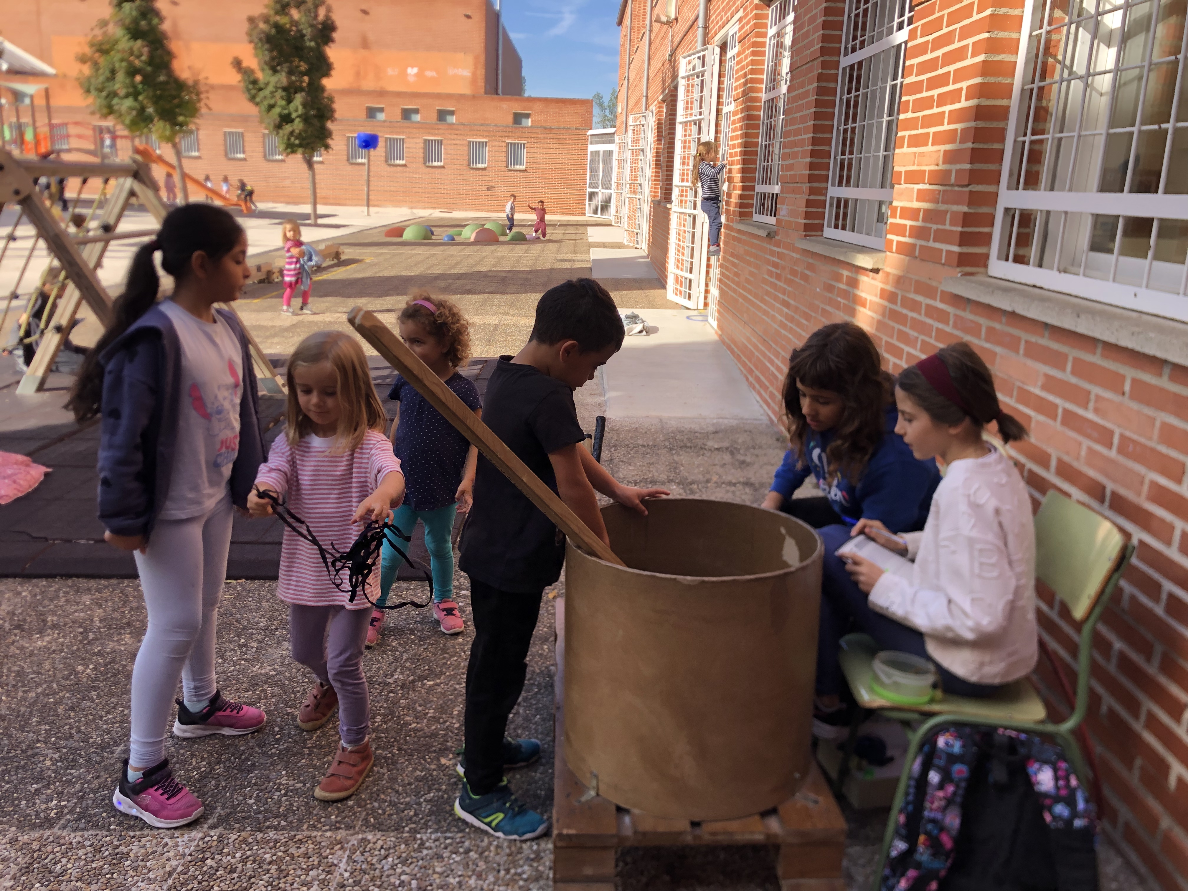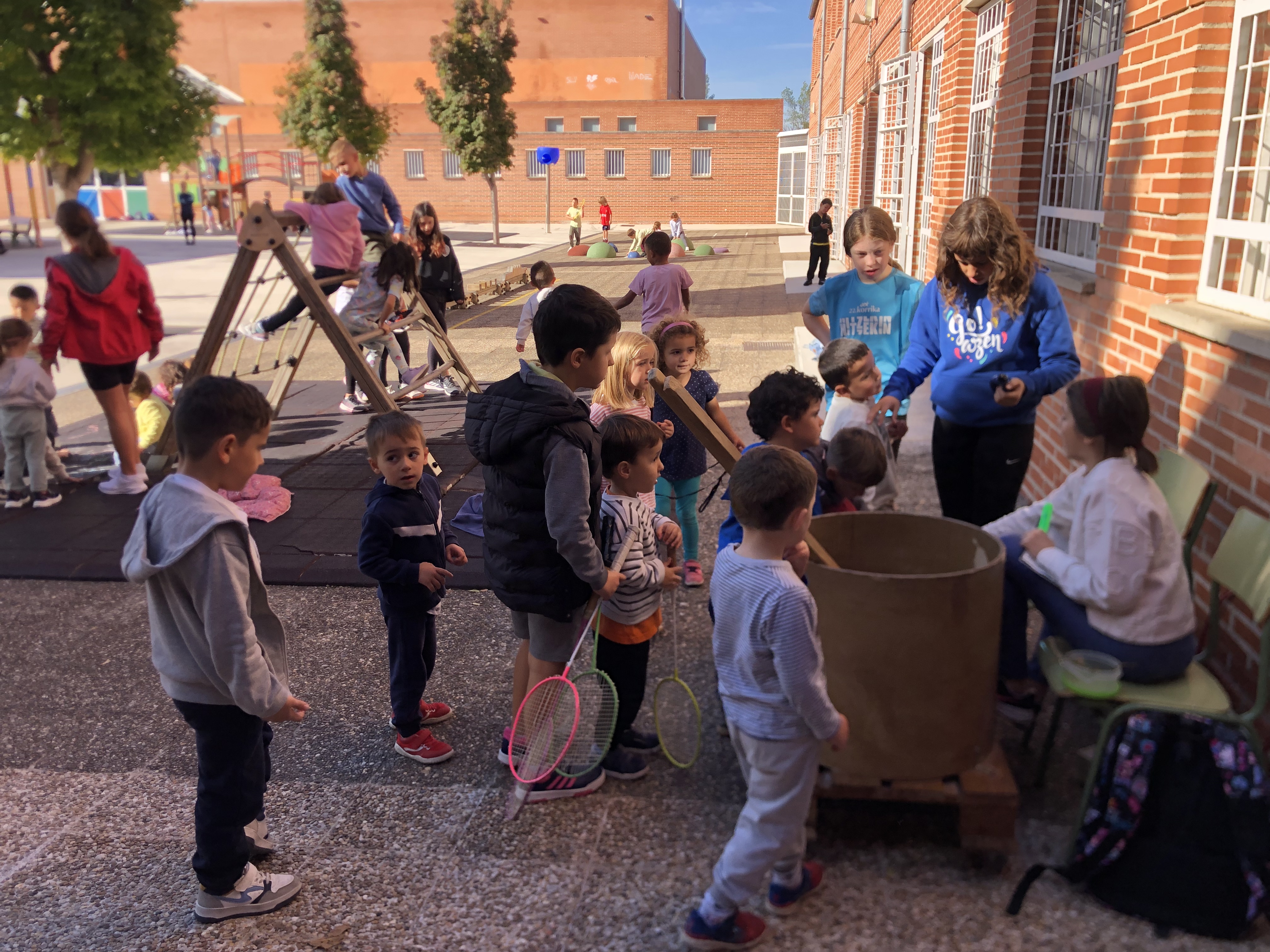 Cuerdas, zancos, tizas, balones, Dobble grande, zancos pequeños, material para voley y bádminton y balón para el juedo de ajedrez. Como no teníamos muchos juegos en el patio decidimos sacar el carro.